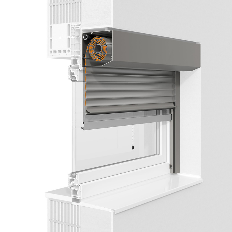 Kennzeichen ist die fünfeckige Kastenform und individuelle Zusatzausstattungen wie etwa Insektenschutzgitter ergänzen dieses Rollladensystem.